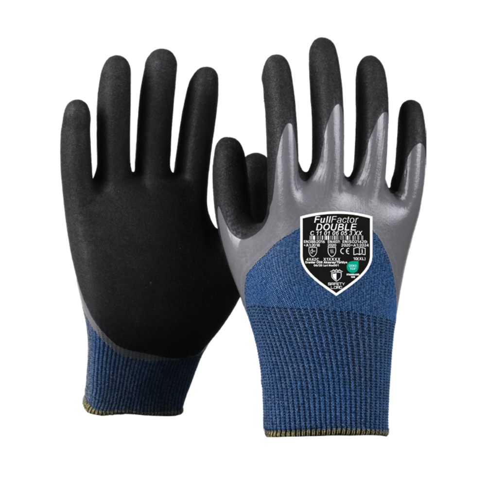 • The cut protection of the liner knitted with yarn specially prepared for FullFactor Double C, the first coating that prevents liquid transfer and the second coating with sandy finish technology come together in FullFactor Double C