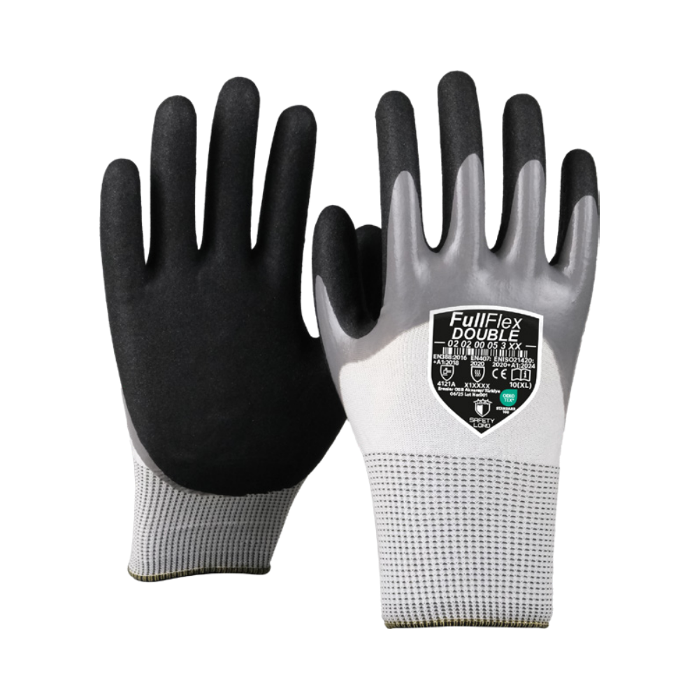 • Never compromising on ease of use thanks to its flexible structure, FullFlex Double reduces liquid and oil permeability to zero with the first coating, while guaranteeing non-slip thanks to the second coating with sandy finish technology.