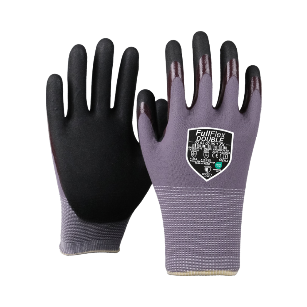 • Never compromising on ease of use thanks to its flexible structure, FullFlex Double reduces liquid and oil permeability to zero with the first coating, while guaranteeing non-slip thanks to the second coating with sandy finish technology.